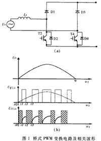 图1(a)所示为工作在PWM整流状态的H型桥式PWM变换电路(此图为正弦波正半波输入下的等效电路,上半桥的两只IGBT未画出),图1(b)为下半桥两只大功率器件的驱动信号和相关的器件波形。现以正半波工作过程为例进行分析(对于三相PWM电路,在整流、逆变工作状态或单相DC/DC工作状态下,PWM电路的分析过程及结论基本类似)。