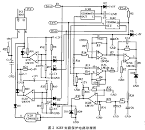 由对图1所示电路的分析,可以得到IGBT短路保护电路的原理电路图,如图2所示。在图2所示电路中IC4及其外围器件构成选通逻辑电路,由IC5及其外围器件构成滤波及放大电路,IC2及其外围器件构成门限比较电路,IC1及其外围器件构成保持电路。正常情况下,D1、D2、D3的阴极所连接的IC2D、IC2C及CD4011的输出均为高电平,IC1的输出状态不会改变。假设由于某种原因,在给T2发驱动信号的时候,H型桥式PWM变换电路的左半桥下管T2的管压降异常升高(设电平值为"高"),即T2-d端电压异常升高,则该高电平UT2-d通过R2加在D8的阴极;同时,发给T2的高电平驱动信号也加在二极管D5的阴极。对IC2C来说,其反相输入端为高电平,若该电平值大于同相输入端的门槛电平值的话,则IC2C输出为"低"。该"低"电平通过D2加在R-S触发器IC1的R输入端,使其输出端Q的输出电平翻转,向控制系统发出IGBT故障报警信号。如果是由于右半桥下管T4的管压降异常升高而引起IC2D输出为"低",则该"低"电平通过D1加在R-S触发器IC1的R输入端,使其输出端Q的输出电平翻转,向控制系统发出IGBT故障报警信号。由IC5A和IC5C及其外围器件构成的滤波及放大电路将选通电路送来的描述IGBT管压降的电压信号进行预处理后,送给由IC5B构成的加法器进行运算处理。若加法器的输出电平大于由R22和R32确定的门槛电平,则会使R-S触发器IC1的R端的第三个输入端为"低",也向控制系统发出IGBT故障报警信号。改变由R22和R32确定的门槛电平,就可以灵活地改变这第三路报警信号所代表的物理意义,从而灵活地设计保护电路。图2中的端子T4-d、T2-d,分别接在T4、T2的集电极上,T4-G、T2-G分别接IGBT器件T4、T2的驱动信号。在电路设计时应该特别注意的是,D8、D5、D9、D4必须采用快速恢复二极管。